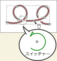 (ノードツール)に切り替え、パス上をクリックすると、パスの交点の部分に矢印つきの緑の円が表示されます。この円を[スイッチャー]といいます。