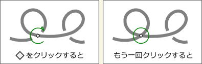 [スイッチャー]は1つのパスに1つだけしか表示されません。別の交点を編集したい時は、中央のひし形をつかんで任意の交点へドラッグします。