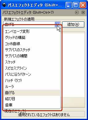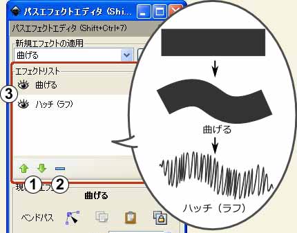 下記の例では、選択中のパスには[曲げる]と[ハッチ(ラフ)]の2つのエフェクトが設定されていることを表しています。