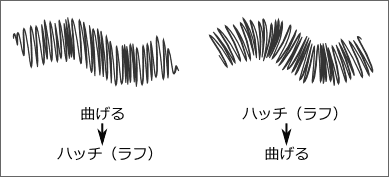 例えば、下記のように、[曲げる]の後に[ハッチ(ラフ)]を適用するのと、[ハッチ(ラフ)]の後に[曲げる]を適用するのとでは結果が異なります。