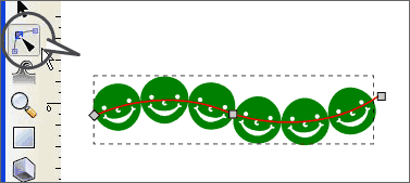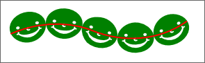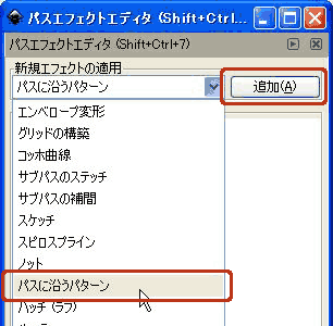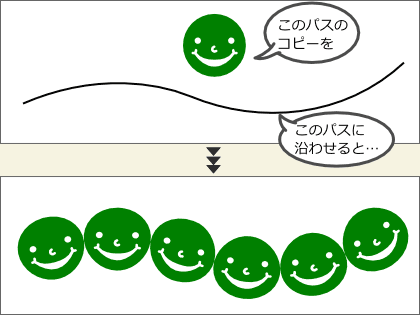 この[パスに沿うパターン]エフェクトは、[エクステンション]メニューの[パスをパターンに沿わせる]という機能を元に作られています。また、[エクステンション]メニューには[散乱]という機能があり、こちらもまた[パスをパターンに沿わせる]から派生した機能です。