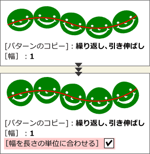 パターンのコピー]を[繰り返し、引き伸ばし]または[単独、引き伸ばし]に設定している場合に有効なオプションで、ONにすると、引き伸ばして横長に変形しているものを等倍にします。