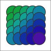 まず、下記のようなものを作りました。円形のオブジェクトをタイルクローンを使って少しずつ重なるように配置し、ついでに色も変化させています。全体を囲って選択し、いろいろな設定をして[適用]を押してみます。