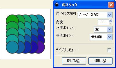 [再スタック方向]を[右→左(180)]に設定し、[角度]を[180]にすると、円が右から左へ積み重なります。