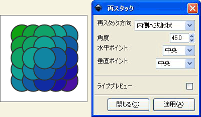 [再スタック方向]を[内側へ放射状]に設定、[水平ポイント]と[垂直ポイント]を共に[中央]に設定し、[角度]に45、135、225、315度のいずれかを設定すると、円が外側から内側に向かって積み重なっていきます。