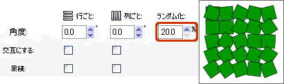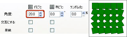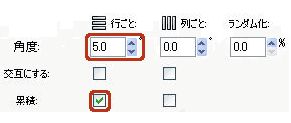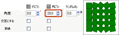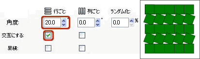 チェックを入れると、[角度(①)]で設定した回転を交互(1行おき、または1列おき)に実行します。