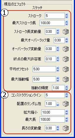 [現在のエフェクト]欄を大きく分けると、『ストローク』(①)と『コンストラクションライン』(②)の2種類の線の設定に分かれます。