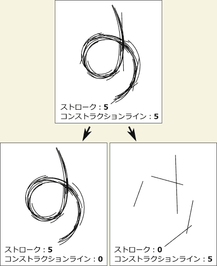 上が両方を設定している状態、左下が『ストローク』、右下が『コンストラクションライン』だけの状態にしたものです。