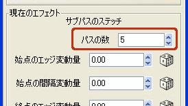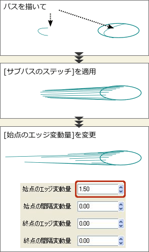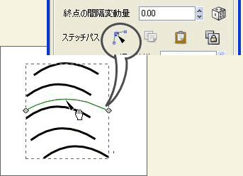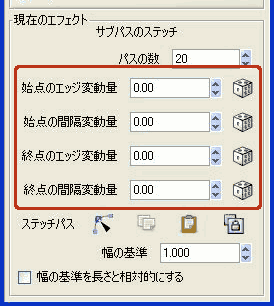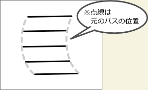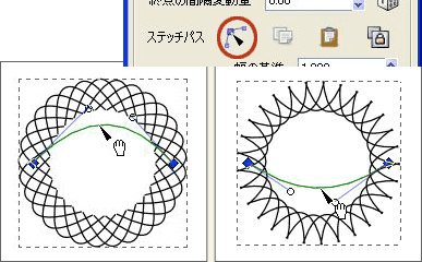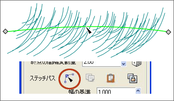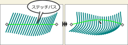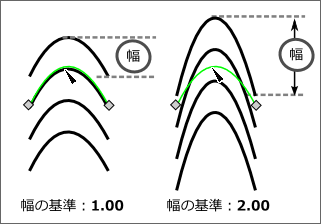 ステッチパスを湾曲させたとき、[幅の基準]の値よってサブパスの変化のしかたが変わります。
