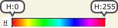 [H]の値は、左端の赤が最小値(0)、黄 → 緑 → 青 → 紫・・・と右へ進むにつれて数値が大きくなり、右端の赤紫が最大値(255)になります。