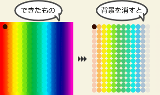 [RGB]値の[G]値を含んでいるところに、背景と同色のクローンが作られます。また、同時に[不透明度]も設定しているので、[G]の値が少ないほど不透明度は低く(透明に近く)なります。