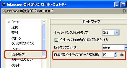 をクリックして[Inkscapeの設定]を開き、[ビットマップ]の項目を選択します。