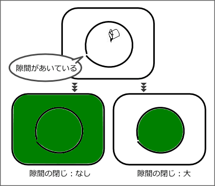 境界に小さな隙間があいている場合でも、[なし]以外に設定すると、閉じた境界として認識ます。どの程度の隙間までが許容範囲なのかを、[小][中][大]の3段階で選べます。