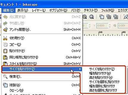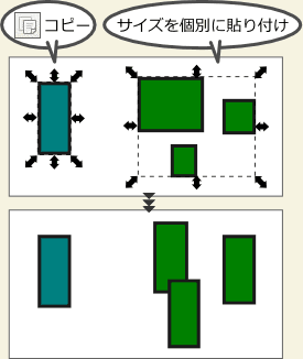(切り取り)を選択した後、メニューバーの[編集]メニューより[サイズを貼り付け]から各項目を選択すると、コピー元のオブジェクトサイズと同じサイズにすることができます。