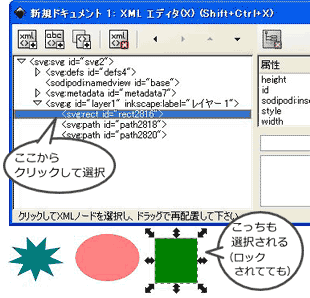 [XML エディタ]を開き、ロック解除したいオブジェクトを探してリスト上で選択します。すると描画上のオブジェクトも選択されます。