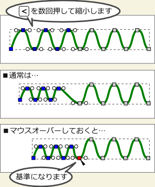 通常は全選択ノードの中心点が、変形/回転の基準点になりますが、ノードの上にマウスを置いておくと、そのノードの位置が基準点になります。基準点に使うノードは、別オブジェクトのノードでも可能です。