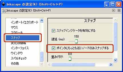 をクリックして[Inkscapeの設定]を開き、[スナップ]の項目をクリックして[ポインタにもっとも近いノードのみスナップする]にチェックを入れます。