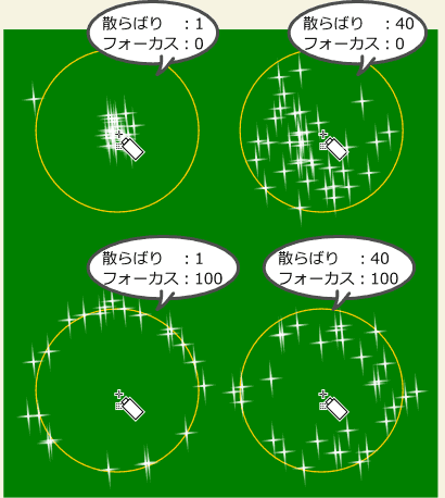 [フォーカス]は、値が0のときは円の中心点を中心にオブジェクトをスプレーしていきます。数値が大きくなるにつれて範囲が拡大していき、100のとき、円の輪郭線上にスプレーしていきます。