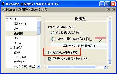(微調整ツール)をダブルクリックして、[Inkscapeの設定]の[微調整]の項目にある、[選択キューを表示する]にチェックを入れておくと、選択中の点線枠が表示されるようになります。