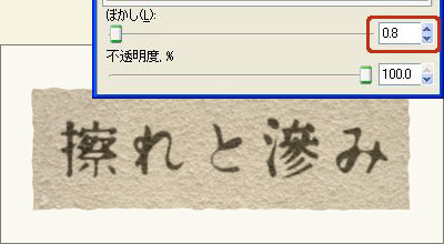 ]ダイアログを開き、文字を選択後、[ぼかし]を0.8%に設定しました。