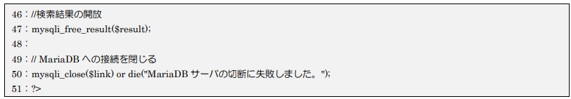 47行目で結果セットはこの後の処理で使用しないため開放を行い、最後に50行目でMariaDBサーバの切断を行っています。
