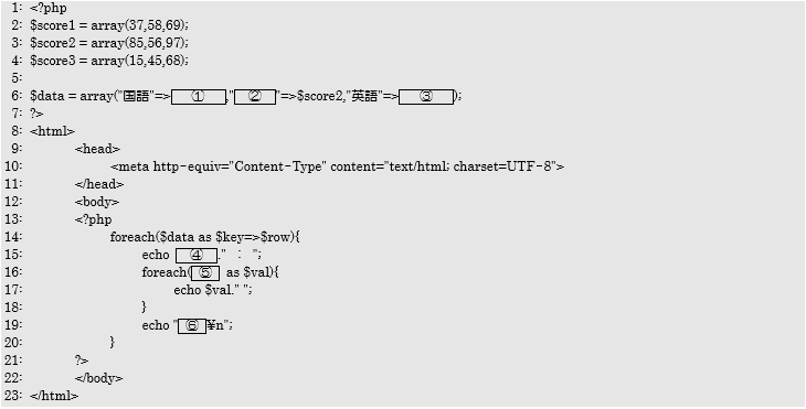 問2 以下の実行結果になるpractice0501.phpのソースコードの空欄①~⑥を答えなさい。