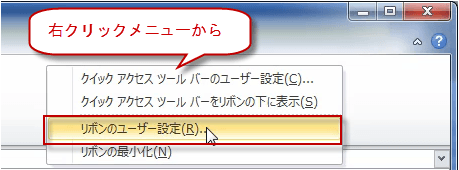 リボンのユーザ設定画面を表示したところです。