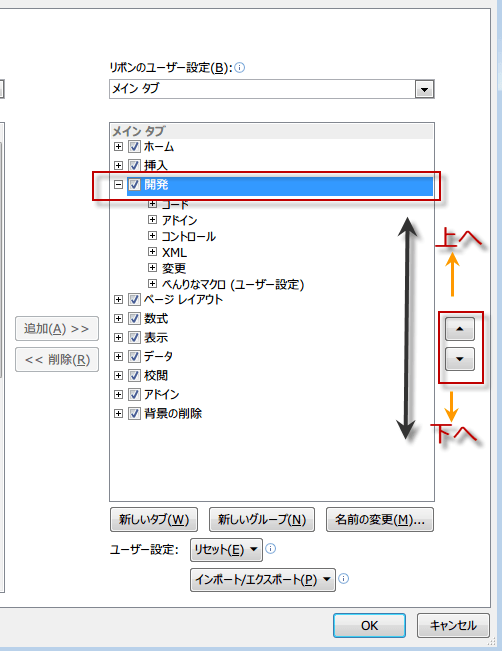 リボンのユーザー設定で順番を変更したいタブを選択します。