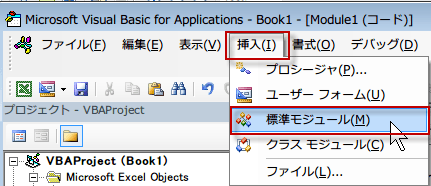 次に、VBEメニューの挿入ボタンから、標準モジュールをクリックします。
