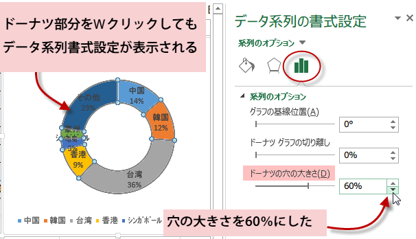 系列のオプションから、ドーナツの穴の大きさをパーセンテージで指定します。デフォルトは75%。例では60%に変更しています。