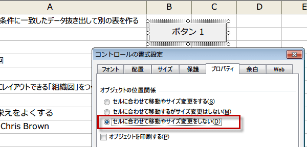 コントロールの書式設定ダイアログが表示されたら、プロパティタブをクリックし、オブジェクトの位置関係の
