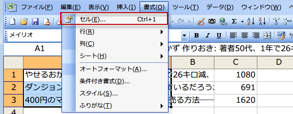 折り返し表示したいセルをクリックし、「書式」→「セル」を選択します。