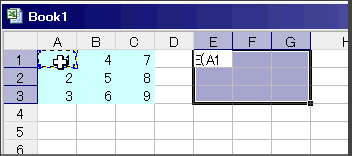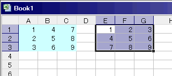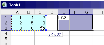コピー先の範囲E1:G3を選択します。