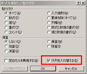 (4) ダイアログボックスが表示されますので「行列を入れ替える」にチェックして「OK」ボタンをクリックします。