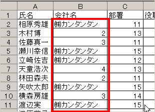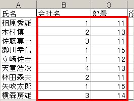 あらかじめ「1は潟Jンタンタン」「11は総務」など決めて、エクセルの表にはその数字を入力します。 全体の入力が終わったら、「会社名」と「部署・役職」に入力した数字を正しい文字列に変換すればいいわけです。