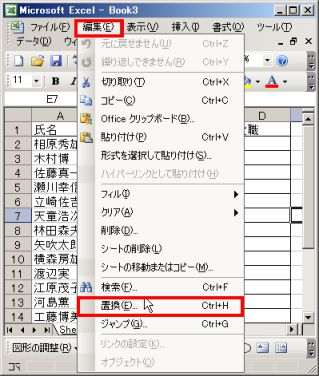 (1)メニューから「編集」→「置換」をクリックします。 (2)「置換」の画面が表示されます。