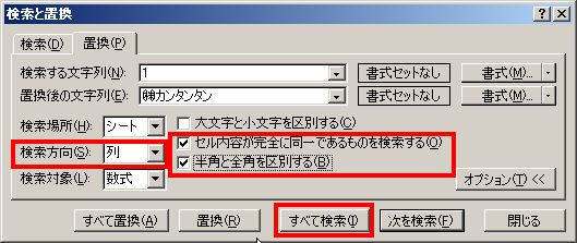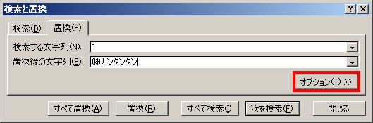 (4)最後に「すべて置換」をクリックします。ここでは、「検索する文字列」に「1」を、「置換後の文字列」には「潟Jンタンタン」を入力しました。