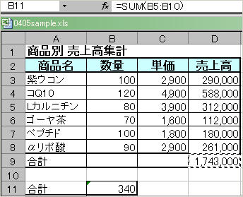 通常のコピーの場合は、「D9」セルをコピーして「B11」セルに貼り付けます。数式バーに「=SUM(B5:B11」と表示され、式がコピーされたのがわかりますね。