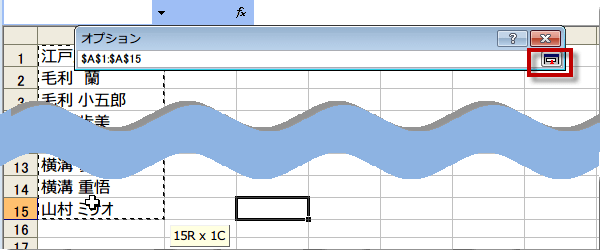 シート上に社員リストがある場合は、それを利用して登録することができます。新しいリストを選択して、ダイアログ縮小ボタンをクリックします。
