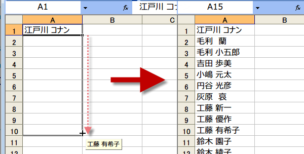 シートに江戸川 コナンと入力し、フィルハンドルをドラッグします。