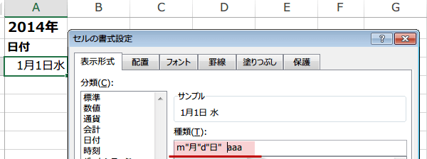 そこに、「m"月"d"日" aaa」と入力し、