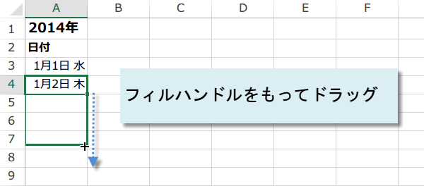 ドラッグすれば、1月3日以降の日付は自動的に設定されます。