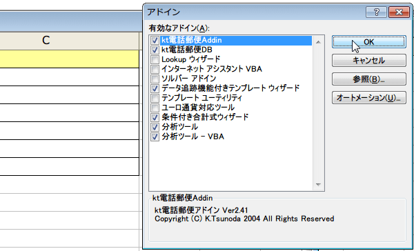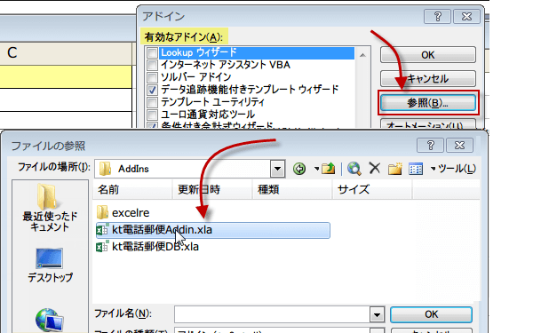 「kt電話郵便Addin.xla 」「kt電話郵便DB.xla」の2つをそれぞれ登録します。