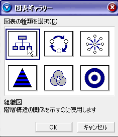 図表ギャラリーには、組織図・ドーナツ型図表・放射型図表・ピラミッド型 図表・ベン図形型図表・ターゲット型図表が用意されています。