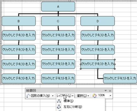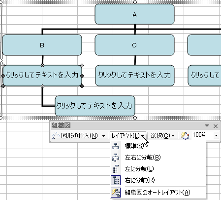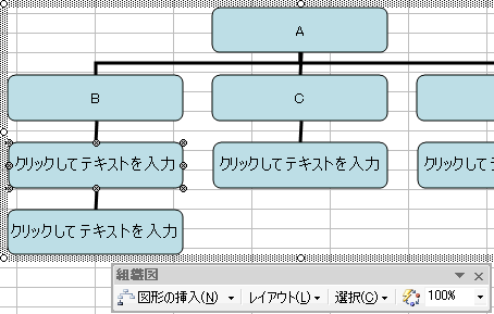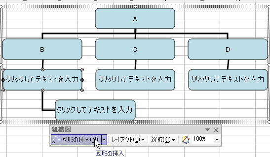 組織図バーの図形の挿入をクリックして、部下を追加していきます。