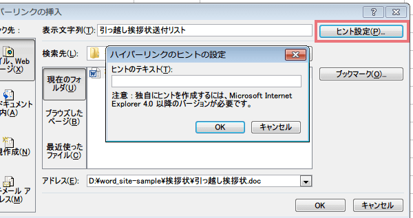 (4)「ハイパーリンクのヒントの設定」ダイアログボックスが表示されますので、「ヒントのテキスト(T)」の中に入力し、「OK」ボタンをクリックします。