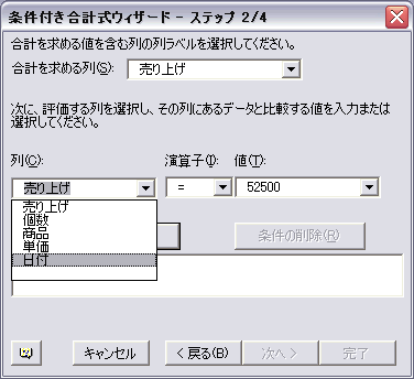 [条件付き合計式ウィザード-ステップ2/4]で、合計を求める値がある列、を選択します。▼で列ラベルが選択できます。