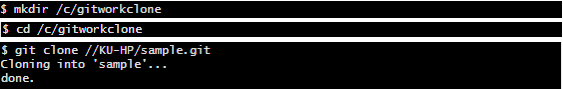 リポジトリをクローンするディレクト:/c/gitworkcloneを作成する。そのディレクトに移動して、git cloneコマンドを実行する。