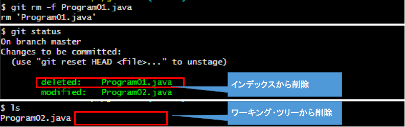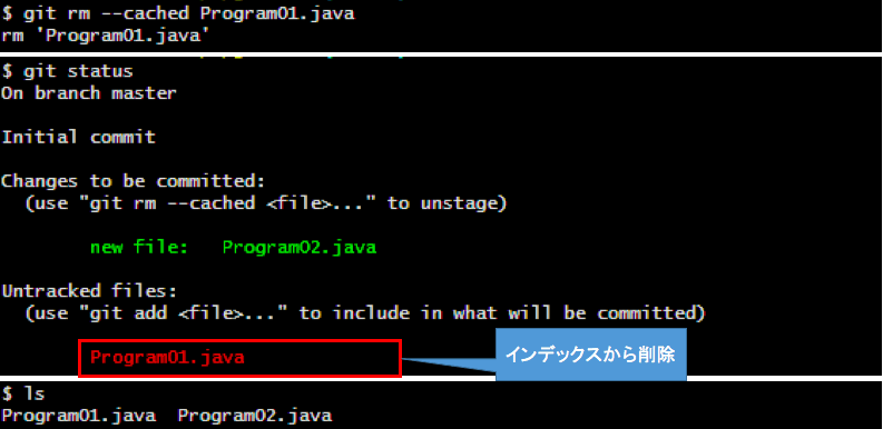 コマンドのオプションで指定したProgram01.javaファイルがインデックスから削除されている。しかし、ファイルは残っている。