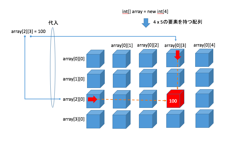 配列に値を代入する例を示す。4 x 5の要素を持つ配列を作ると、インデックスが0から始まるので最初の「インデックス1」は0から3になる。続く「インデックス2」は0から4になる。